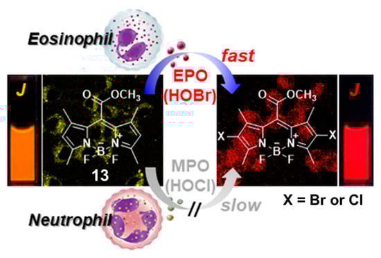 Given the aggregation-induced emission enhancement (AIEE) properties of BODIPY derivative 13 through J-aggregation [102], Kim and coworkers demonstrated that 13 was also an efficient fluorescent probe for selective recognition of HOBr via dibromo substitution (Figure 13) [103]. In aqueous solution (100 mM acetate buffer, pH = 5.0, containing 0.1% CH3CN), this probe had the absorption and emission maxima centered at 580 and 581 nm, respectively. The addition of HOBr triggered the characteristic absorption and emission bands to decrease markedly and red-shift to 613 and 616 nm (ca. 22-fold fluorescence enhancement at 616 nm), respectively. These spectral changes could be ascribed to the suspended aggregates of the formed dibrominated product, which was confirmed by HPLC-MS analysis. HOBr also induced a naked-eye observable color change of the solution from pink to purple, together with a fluorescence color change from orange to red under UV lamp irradiation (365 nm). This probe showed extremely fast response (<2 s) for HOBr, and maintained its sensing ability in a pH range from 4.0 to 9.0. The emission ratio (F616 nm/F581 nm) of 13 was linearly dependent on the concentration of HOBr in the range of 1.0–5.0 μM, from which the detection limit was deduced to be 3.8 nM. The other ROS, and commonly-seen amino acids, biothiols as well as hydrolytic enzymes (including esterase, trypsin, lipase, lysozyme) did not interfere with the selective recognition of HOBr. Specifically for HOCl, this ROS could also react with 13 to give the dichlorinated product but even at a large excess amount ([HOCl]/[13] ≥ 80). As a result, probe 13 was halogenated with a much higher kinetic selectivity for HOBr over HOCl (≥1200 fold). Benefiting from the obtained advantageous photophysical properties, probe 13 was successfully applied to monitoring EPO activity and fluorescence assays of oxidative stress in cancer cells as well as immune response detection in live mice.