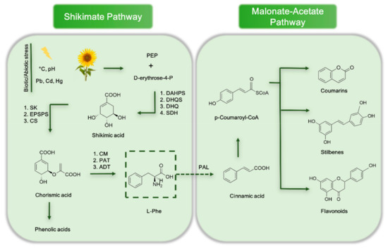 Schematic showing of the shikimate and malonate-acetate pathway in plants. Note: DAHPS—3-deoxy-d-arabino-heptulosonate-7-phosphate synthase; DHQS—3-dehydroquinate synthase; DHQ—3-dehydroquinate dehydratase; SDH—shikimate dehydrogenase; SK-shikimate kinase; EPSPS—5-enolpyruvylshikimate 3-phosphate synthase; CS—chorismate synthase; CM—chorismate mutase; PAT—prephenate aminotransferase; ADT—arogenate dehydratase; PAL—phenylalanine ammonia-lyase; PEP—phosphoenolpyruvic acid.