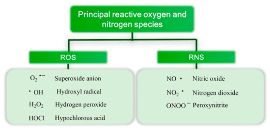 Free radicals are a physiological product of our metabolic reactions and are required for the correct preservation of such functions as signal transduction, gene expression, and cell proliferation. This explains why some of the main sources of ROS and reactive nitrogen species (RNS) are vital cellular mechanisms. The main ROS and RNS present in the human body are illustrated in Figure 3.