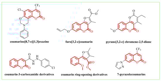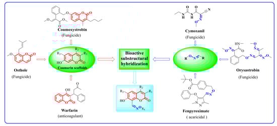 Coumarin derivatives, the typical natural products containing benzopyrone structures, have widely served as secondary metabolites in plants [8,9]. Interestingly, the natural coumarins exhibit the noticeable bioactivities including antitumor, anticoagulant, anti-inflammatory, antioxidant, antifungal and antiviral effects [10,11,12]. In view of this, coumarin derivatives have been widely applied to agricultural and medicinal chemistries. The corresponding synthesis methods and pharmacological activities were also well reported, such as Osthole, Coumoxystrobin and Warfarin (Figure 1). Employing Osthole as a lead structure, our group synthesized a series of coumarin derivatives against the phytopathogenic fungi effectively (Figure 2), including coumarin [8,7-e][1,3]oxazine [13], furo[3,2-c]coumarin [14], pyrano[3,2-c]chromene-2,5-dione [14], coumarin-3-carboxamide derivatives [15], coumarin ring-opening derivatives [16] and pyrrole/pyrazole-substituted coumarin derivatives [17]. Due to the pharmacological diversity of coumarin derivatives, it has been described as one of “privileged scaffolds” [18,19]. Obviously, the diversified derivatization of the coumarin parent ring is an important strategy for the development of highly effective compounds, making coumarin a candidate for the development of more efficient compounds.