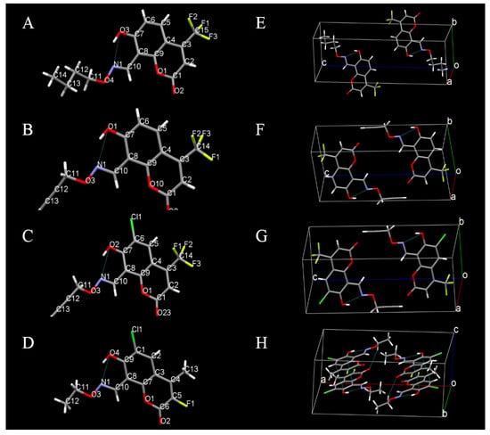 (A–D) The crystal structural diagram of 4e, 4h, 5h and 6c. (E–H) The corresponding crystal packing diagram of 4e, 4h, 5h and 6c.