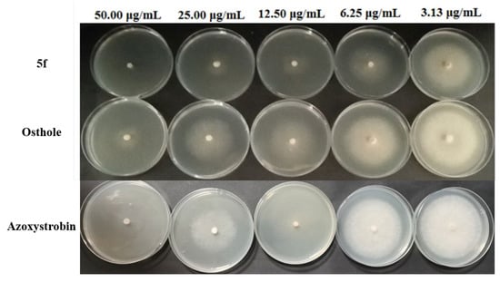To better investigate the inhibitory performance of target compounds against phytopathogenic fungi, the compounds that exhibited the inhibition rates exceeding 60% at 100 μg/mL were further tested for their EC50 values. Osthole and Azoxystrobin were served as the positive control. As exhibited in Table 3, the EC50 values of target compounds 5f and 6h were notably as low as 5.75 μg/mL and 13.75 μg/mL, proving that they were much more effective than Osthole (33.20 μg/mL) and Azoxystrobin (64.95 μg/mL) against B. cinerea. Meanwhile, as listed in Table 4, the EC50 values of all the detected compounds were lower than Osthole (67.18 μg/mL) against R. solani. Specifically, the EC50 values of the target compounds 2b, 4f, 5a, 5f and 6f were 17.72, 7.48, 33.10, 28.96 and 28.70 μg/mL, respectively. The corresponding in vitro antifungal performances of compound 5f, Osthole and Azoxystrobin against B. cinerea were presented in Figure 4, which visually exhibited the corresponding in vitro inhibition of B. cinerea.