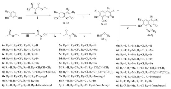 To synthesize a series of fluorinated 7-hydroxycoumarin oxime ether derivatives, seven O-substituted hydroxylamines 3d–3j were synthesized according to the reported methods with the use of cheap raw materials (Scheme 1) [32]. Compounds 3a (hydroxylamine), 3b (N-methylhydroxyamine) and 3c (N-ethylhydroxylamine) in the form of the hydrochloride salt were commercially available.