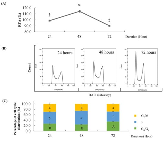 Effects of different time points on relative telomerase activity (RTA) and percentage of HCT 116 cell cycle distribution. (A) Telomerase activity of HCT 116 harvested at different time points relative to telomerase-positive control (HEK293). Values are mean ± standard error of triplicate. Mean with different symbols (†, ※, or ‡) differ significantly at p < 0.001. (B) Representative cell cycle histogram of HCT 116 harvested at different time points stained with DAPI and analyzed by flow cytometry. (C) Percentage of cell cycle distribution of HCT 116 at different time points analyzed by FlowJo version 10. Values are mean ± standard error of triplicate. Mean with different letters differ significantly at p < 0.05 (subject to different cell cycle phases). G: Growth, S: Synthesis, M: Mitosis.