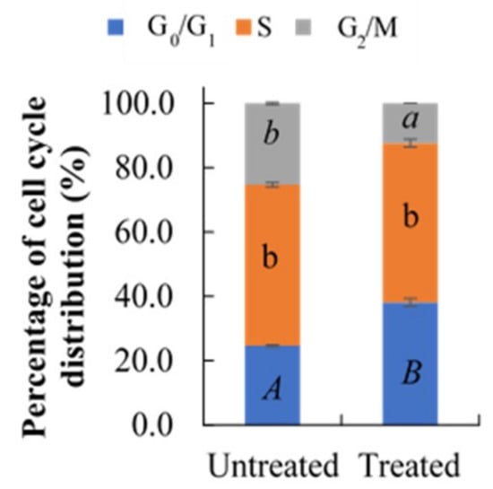 Effect of 10.54 µg/mL berberine treated HCT 116 at 48 h on the percentage of cell cycle distribution. Values are mean ± standard error of triplicate. Mean with different letters differ significantly at p < 0.001 (subject to different cell cycle phases).