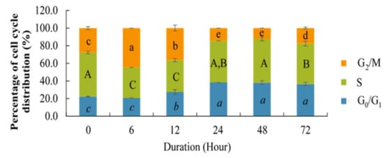Changes in the percentage of HCT 116 cells in G0/G1, S, and G2/M phases at different durations following treatment with 10.54 µg/mL berberine. Values are mean ± standard error of triplicate. Mean with different letters differ significantly at p < 0.001 (subject to different cell cycle phases).