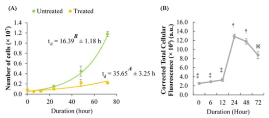 (A) Growth curve of untreated and 10.54 µg/mL berberine-treated HCT 116. Values are mean ± standard error of biological quadruplicate. td: doubling time. (B) Corrected Total Cellular Fluorescence (CTCF) of berberine-treated HCT 116 at different durations. Values are mean ± standard error of biological triplicate. a.u.—arbitrary unit. Mean with different letters or symbols (‡, †, or ※) differ significantly at p < 0.001.