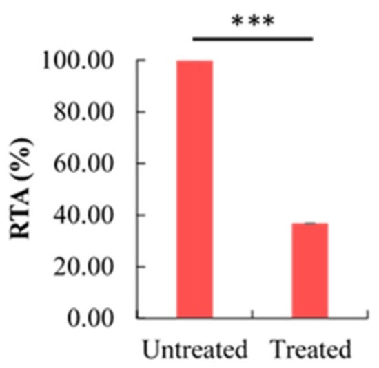 Effect of 10.54 µg/mL berberine-treated HCT 116 at 48 h on relative telomerase activity (RTA). Values are mean ± standard error of triplicate. Means with *** (triple asterisks) differ significantly at p < 0.001.
