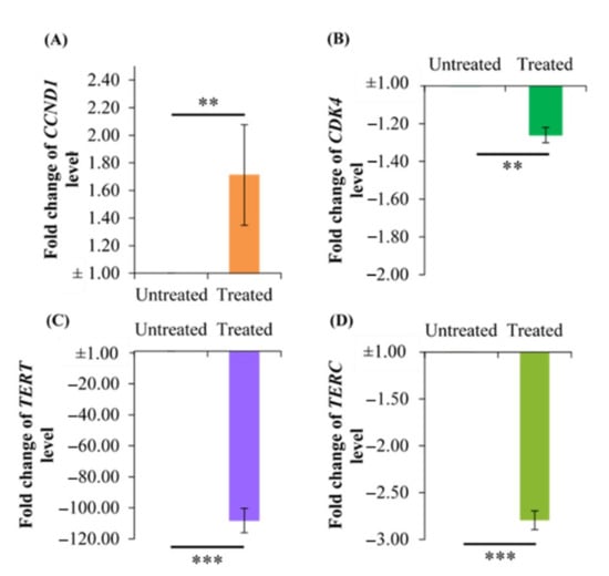 Effect of 10.54 µg/mL berberine-treated HCT 116 at 48 h on (A) CCND1, (B) CDK4, (C) TERT, and (D) TERC levels. Changes in RNA levels are expressed as fold change in RNA levels relative to untreated HCT 116 at 48 h. Values are mean ± standard error of quadruplicate. Mean with ** (double asterisks) or *** (triple asterisks) differ significantly at p < 0.01 or p < 0.001, respectively.