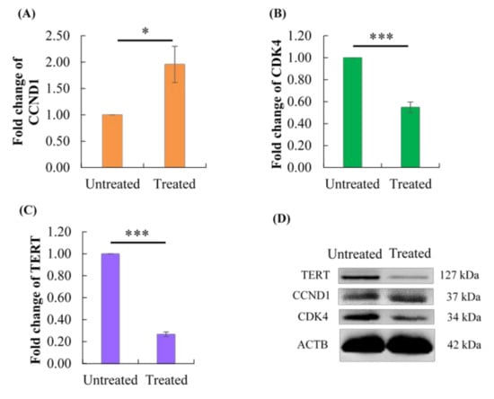 In total, 1 × 106 harvested cells were lysed in 60 µL Radio Immunoprecipitation Assay (RIPA) lysis buffer containing 1% protease inhibitor cocktail, sonicated on ice bath for 1 min, incubated for 30 min on ice, followed by centrifugation at 14,000× g for 15 min to pellet the cell debris, and subjected to protein estimation by employing Bradford Assay. Then, 20 µg of total protein denatured at 70 °C were separated on 4% and 12% SDS-polyacrylamide stacking and resolving gels, respectively. Electrophoresis was done at 80 V for 30 min, followed by 100 V for 1 h 40 min using pre-chilled (4 °C) 1× SDS running buffer, followed by protein transferring onto 0.22-µm nitrocellulose membrane (Pall Corp., Morelos, Mexico). Electroblotting was conducted using a Mini-Protean® Tetra System (Bio-Rad Laboratories, Hercules, CA, USA) with pre-chilled (-20 °C) 1× SDS transfer buffer and ice pack (−80 °C) for 1 h 40 min on ice. The membrane was removed and incubated in Blocking One (Nacalai Tesque, Kyoto, Japan) for 1 h at room temperature, on a shaker at 100 rpm. The membrane was incubated for at least 13 h in a cold room (5–10 °C) and was constantly shaken at 90 rpm in monoclonal primary antibody at 1:1000 dilution for ACTB and 1:100 dilution for CCND1, CDK4, and TERT, respectively, in Blocking One. The membrane was then washed 3 times with 1× Tris-buffered saline containing 0.1% Tween 20 (TBST), 5 min each time, and on a shaker at 120 rpm. The membrane was incubated on a shaker at 90 rpm with m-IgGκ BP-HRP at 1:10,000 dilution in Blocking One for 2 h at room temperature. The 1× TBST washing step was repeated as previously stated. The membranes were incubated in chemiluminescence solution of Western Bright Sirius (Advansta, San Jose, CA, USA) following the manufacturer’s protocol before the membrane was visualized, and the image was captured using Gel Documentation System Fusion FX7-7026 (Vilber Lourmat, Marne-la-Vallée, France). ACTB was used as the loading control. Protein signal intensities were analyzed by using ImageJ version 1.52a. CCND1, CDK4, and TERT protein signal intensities were normalized to the loading control.