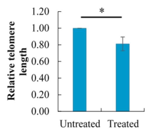 Consistent with the significantly impaired telomerase activity and level by berberine treatment, telomere attrition also occurred as anticipated (Figure 8), whereby the relative telomere length of berberine-treated HCT 116 after 48 h was 0.81 ± 0.08, compared to untreated HCT 116 (with a relative telomere length of 1.0).