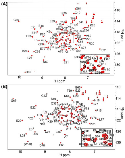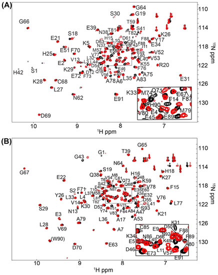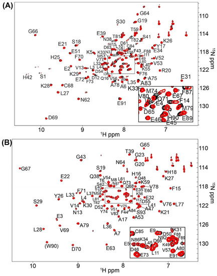 NMR data of S100B and S100A1 in the presence of the S100B specific inhibitor SEW01483. 2D-[1H, 15N]-HSQC overlays of (A) Ca2+-S100B and (B) Ca2+-S100A1 with (red) and without (black) the S100B-specific compound SEW01483. The NMR data was collected in the same manner for both S100 proteins under identical buffer conditions, at 800 MHz, 37 °C, as described in Methods.