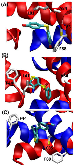 Predicted binding mode of (A) BTB10184 (B) KM01765 and (C) SEW01483 for Ca2+-S100A1. Residues in the pocket with large spectral perturbations are labeled. The two subunits of the S100 protein are colored in blue and red, respectively.