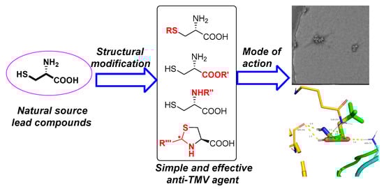 It is an important research direction for us to find effective antiviral candidates based on natural products [24]. In our previous work, a series of amino acid gossypol Schiff bases were designed and synthesized. The structure-activity relationship revealed that both the carboxy group and substituents in amino acids had significant effect on anti-TMV [25]. Combined with our existing work experience and the above findings, we made systematic research on cysteine and its derivatives (Figure 1) in the present work. All synthetic compounds were characterized by 1H-NMR, 13C-NMR, and HRMS. The antiviral and antifungal activities of these compounds and the structure-activity relationship were evaluated systematically.