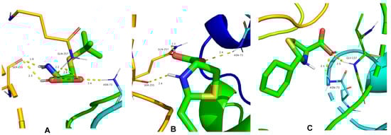 Molecular docking studies were performed to explore the binding sites of cysteine derivatives on TMV CP. Compounds 3, 23, and 24 were selected for molecular docking with TMV CP (PDB code 1EI7). The results showed that compound 3 has lain into the TMV CP activity pocket of SER 255, ASN 73, and GLN 257 (Figure 5A). Compound 3 forms five conventional hydrogen bonds with the active site of SER 255 (1.9 Å and 2.3 Å), GLN 257 (2.2 Å and 2.8 Å), and ASN 73 (2.4 Å) (Figure 5A). Compound 23 forms three conventional hydrogen bonds with the active site of SER 255 (2.4 Å), GLN 257 (1.2 Å), and ASN 73 (2.4 Å) (Figure 5B). As seen in Figure 5C, compound 24 forms two conventional hydrogen bonds with ASN 73 (2.1 Å) and GLY 137 (2.5 Å). The molecular docking results indicate that these compounds interact with CP through hydrogen bonding. The results of molecular docking also showed that compound 3 had more binding sites with TMV CP and shorter hydrogen bond distance. The stronger the interaction with TMV CP, the greater influence on the assembly of TMV, and the higher the inhibition rate. This result is consistent with the activity test.