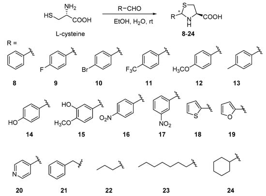 Cysteine and its derivatives 1–7 (Figure 2) were purchased directly. A series of thiazole ring containing L-cysteine derivatives 8–24 were designed and synthesized from L-cysteine and different substituted aldehydes (Scheme 1) by a one-pot method [7,26].