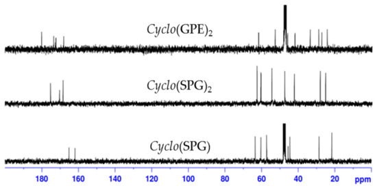 13C-NMR spectra of cyclo(SPG), cyclo(SPG)2 and cyclo(GPE)2 in CD3OD/D2O.