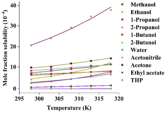 - Ahad, A.; Shakeel, F.; Alfaifi, O.A.; Raish, M.; Ahmad, A.; Al-Jenoobi, F.I.; Al-Mohizea, A.M. Solubility determination of raloxifene hydrochloride in ten pure solvents at various temperatures: Thermodynamics-based analysis and solute–solvent interactions. Int. J. Pharm. 2018, 544, 165–171. [Google Scholar] [CrossRef] [PubMed]