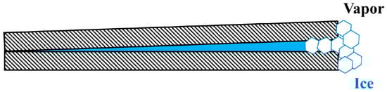 For condensation of water vapor in the presence of a solid particle, the surface of a solid particle is rarely smooth, and the surface topography becomes an important issue. Here, narrow wedges become preferred condensation sites. The contact of a narrow wedge is effectively one–dimensional and adsorption or condensation in a one-dimensional system does not require any surmounting of an activation barrier [31]. As such, condensation proceeds without nucleation of supersaturation. After water vapor has condensed to such a wedge, however, freezing of the condensed liquid water in the narrow wedge may require surmounting of a large activation barrier of the order of 35 K of supercooling [89,92,93,94]. The reason is that, unlike condensation of “shapeless” liquid, nucleation of a solid phase at the very tip of a narrow wedge that is bounded by two foreign solid walls, like the one schematically depicted in Figure 4, does not occur easily because of the general mismatch between the lattices of the nucleating solid phase and the foreign solid walls and, even in a rare case for which perfect lattice matching is achieved between the two solid phases, the angle of the wedge requires distortion of the lattices that costs extra free energy. Instead, nucleation of the solid phase occurs some distance away from the very tip of the narrow wedge and leaves the trapped liquid next to the very tip unfrozen at small supercoolings [95,96]. In short, the free energy reduction due to the wetting by the liquid is sufficient to offset the free energy cost of keeping the small amount of liquid unfrozen below the melting point when the area-to-volume ratio of the pore geometry is sufficiently large, and this condensation can proceed without any supersaturation of the vapor.