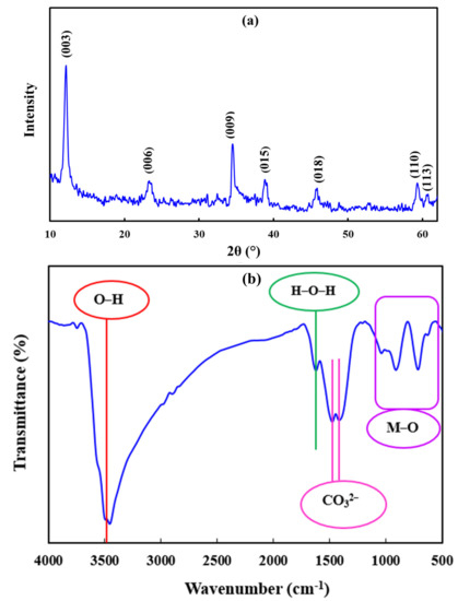 XRD pattern of nanolayered Zn-Fe LDHs (a); FT-IR spectrum of nanolayered Zn-Fe LDHs (b).