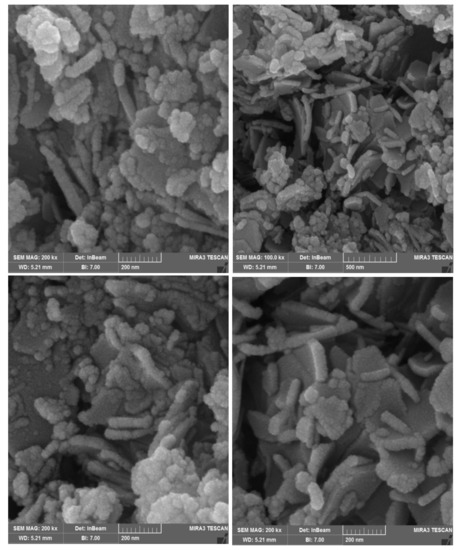The SEM images of the synthesized Zn-Fe LDHs are represented in Figure 2. Layered morphology with an average thickness of 45 ± 0.6 nm can be seen in the SEM images.