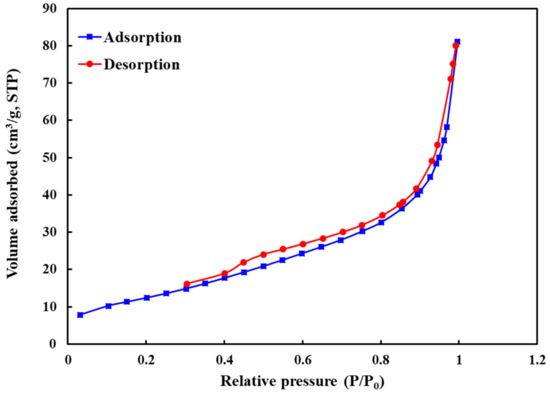The nitrogen adsorption-desorption isotherm of the prepared Zn-Fe LDHs is shown in Figure 3. According to the IUPAC classification, the synthesized LDHs represented type IV isotherm, confirming the mesoporous structure of the synthesized sample. Based on the Brunauer-Emmett-Teller (BET) analysis, the specific surface area of the synthesized LDHs was determined 46.9 m2/g.