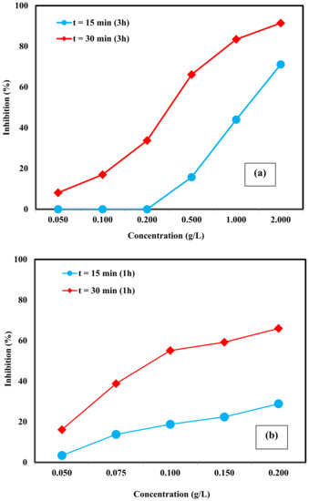 As has been reported previously, NMs can be agglomerated into microscopic particles in a high ionic strength medium as in the present case, inducing a change in their morphology and instability in surface properties [51]. Therefore, modification of the NMs’ structural properties after dispersion into the test media should be considered when evaluating toxicity. Based on the results obtained for 24 h-prepared toxicity samples, the experimental procedure was modified and the sample preparation time was reduced to t = 3 and 1 h. As can be seen from Figure 4a, after 15 min of exposure, only the concentrated samples (= 0.50, 1.00, and 2.00 g/L) showed an inhibitory effect on luminescence intensity. The lowest observed effect (a relative inhibition of 15.8 ± 1.7%) was found for 0.50 g/L catalyst. On the other hand, for the exposure time of 30 min, appreciable inhibition was observed for all tested concentrations. The EC50 values for the 3 h-prepared Zn-Fe LDHs samples were calculated as 1.20 ± 0.12 g/L and 0.32 ± 0.03 g/L for incubation times of 15 and 30 min, respectively. As can be seen in Figure 4b, the highest luminescence inhibition was observed for the Zn-Fe LDHs sample being prepared in 1 h at the concentration range of 0.05–0.20 g/L. The percent relative inhibition of 0.20 g/L catalyst was found as 28.9 ± 0.1% (instead of 0% for 3 h-prepared sample) and 66.0 ± 0.1% (instead of 33.8 ± 0.6% for 3 h-prepared sample) for an exposure time of 15 and 30 min, respectively. The EC50 value was calculated as 0.31 ± 0.03 g/L for t = 15 min, whereas an EC50 value of 0.11 ± 0.01 g/L was obtained for t = 30 min. Sample preparation time affected the toxicity response due to effects such as metal ion release and changes in catalyst structure after the contact with the test medium.
