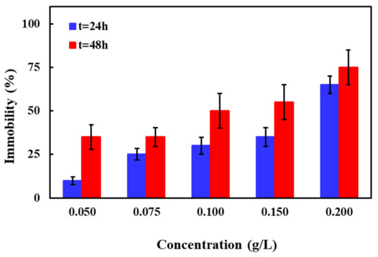Among the invertebrates, D. magna as a representative of zooplankton and a key group for the food web structure has often been used in toxicity tests [47]. In addition to ROS-mediated toxic effects of NMs, “biological surface coating” (i.e., the attachment or adsorption of NMs on the outer surface of the organisms) is suggested as a potential toxicity trigger for test organisms like D. magna [46]. Figure 5 depicts the effect of Zn-Fe LDHs catalyst concentration (0.05–0.20 g/L) on D. magna response for t = 24 and 48 h. As obvious from Figure 5, 10 ± 2% and 65 ± 20% mortalities were observed for 0.05 and 0.20 g/L catalyst t = 24 h, respectively. Mortalities were higher compared to the test control for all tested concentrations at t = 48 h; e.g., 35 ± 20% for 0.05 g/L and 75 ± 10% for 0.20 g/L. Similar to V. fischeri, D. magna toxicity of Zn-Fe LDHs also depended on the exposure time; toxicity of the Zn-Fe LDHs catalyst increased with prolonged test durations. It was observed that Zn-Fe LDHs catalyst particles adhered to the antennae of the daphnids when higher catalyst concentrations and longer incubation times were applied. Despite external surface adhesion, no catalyst was seen in the gut tract of the test organisms. The EC50 concentrations of Zn-Fe LDHs to D. magna were calculated as 0.17 ± 0.02 and 0.10 ± 0.01 g/L for 24 and 48 h of exposure, respectively.