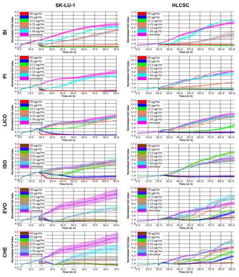 Dose–response curves depicting growth inhibitory kinetics of phytochemicals representatives of alkaloids, chalcones and isothiocyanates in SK-LU-1 and HLCSC. Various phytochemicals were administered at indicated concentrations after initial overnight growth, and the growth was continuously monitored for at least 72 h post-treatment. Curves presented are representative curves from two independent experiments. Error bars are expressed as mean ± SD from duplicated wells.