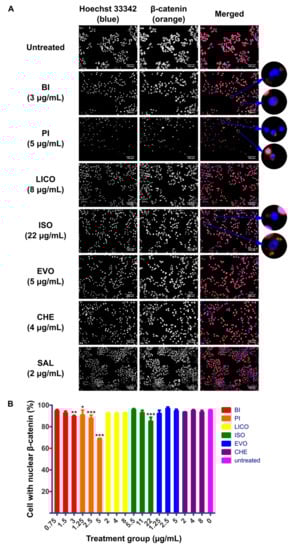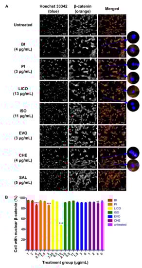 The nuclear localization of β-catenin is considered to be the hallmark activation event of Wnt/β-catenin pathway and therefore inhibition of this event could potentially limit downstream pro-tumorigenic effect of the pathway. In addition to the cytotoxicity and growth arrest capability of phytochemicals that we have shown above, we were interested to characterize the ability of these phytochemicals to disrupt the activity of Wnt/β-catenin signaling by visualizing the nuclear localization activity in response to phytochemicals treatment. SK-LU-1 and HLCSC were first pre-treated with GSK3i at 8 μM for 24 h to maximize the nuclear localization of β-catenin before administering phytochemicals for another 24 h. At least three phytochemicals in each cell lines tested could inhibit localization activity of β-catenin indicated by increased number of cells that only stained blue for nuclei, regardless of whether the cytoplasm stained orange for β-catenin. In SK-LU-1, BI (4 μg/mL, p < 0.001), PI (3 μg/mL, p < 0.001), LICO (13 μg/mL, p < 0.001) and CHE (4 μg/mL, p < 0.01) significantly inhibited the localization of β-catenin to nucleus (Figure 2A,B). On the other hand, BI (3 μg/mL, p < 0.01), PI (1.25 μg/mL, p < 0.05; 2.5 μg/mL, p < 0.001; 5 μg/mL, p < 0.001) and ISO (22 μg/mL, p < 0.001) inhibited the localization in HLCSC (Figure 3A,B). All of these indicate that isothiocyanates (BI and PI) and chalcones (ISO and LICO) may be potent inhibitors of β-catenin nuclear localization as either one or both of the respective phytochemical members exhibited their effects in both examined cell lines. Due to their wider applicability and lower IC50 values to inhibit β-catenin nuclear localization, we selected BI and PI for further characterizations.