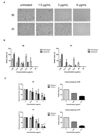 Soft agar colony formation, multicellular tumor spheroid growth, migration and invasion in BI- and PI-treated NCI-H1703. (A) Representatives micrographs of colony formation of NCI-H1703 in soft agar after BI and PI treatment at indicated concentrations. Scale bars represent 1000 μm. (B) Graphs presenting cell viability of parallel set-up of monolayer and spheroid models that were treated with BI and PI at indicated concentrations. (C) Graphs presenting migration and invasion of NCI-H1703 (left) after BI and PI treatments and dose–response graphs (right) of respective phytochemicals at indicated concentrations. Error bars in spheroid cell viability, migration and invasion data were expressed as mean ± SD from three independent experiments. Error bars in dose–response of viable cells data were expressed as mean ± SD from two independent experiments. Statistical significance is expressed as *** p < 0.001; ** p < 0.01; * p < 0.05.