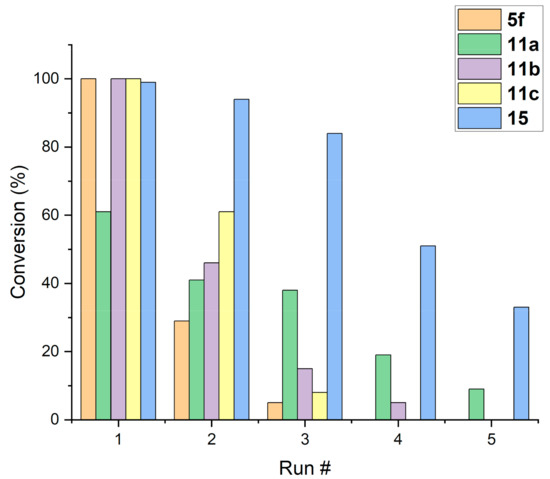 Activity and reusability of catalysts 5f, 11a–c, and 15 were tested in the standard model reaction (6a + 7 → 8a, CH2Cl2, 20 °C, 3 h, 30 mg catalyst loading). The results are summarized in Figure 2. In the first run, quantitative conversion was obtained with catalysts 5f, 11b, 11c, and 15, while catalyst 11a gave only 61% conversion. The catalytic activity of 5f and 11b,c dropped significantly and they became practically inactive after the second run. Surprisingly, the initially least active catalyst 11a lost catalytic activity more slowly than analogues 5f and 11b,c and remained only weakly active in the fifth run. On the other hand, catalyst 15 gave a near quantitative conversion in the second run (94%), followed by a gradual decrease of catalytic activity leading to 31% conversion in the fifth run. Thus, the reusability of N-arylenaminone catalyst 15 was significantly better than that of N-alkylenaminone analogues 5 and 11 (Figure 2). This result was consistent with the hypothesis that the decrease of catalytic activity was largely due to the detachment of the copper-enaminone complex from the solid support by hydrolysis of the C-N bond of the enamine (cf. Scheme 5).