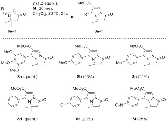 Next, the substrate scope was investigated using 20 mg (~13 mol%) of catalyst 5f in reactions with azomethine imines 6a–f (Scheme 2). After 3 h, only dipoles 6a and 6d were transformed quantitatively into the corresponding cycloadducts 8a and 8d, while conversions of other dipoles ranged from 23% to 95%. The highest conversions (95–100%) were obtained with 3,4,5-trimethoxyphenyl- (6a), phenyl- (6d), and 4-nitrophenyl-substituted dipole (6f), whereas poor conversions (23–29%) were observed with 4-methoxy- (6b), 4-methyl- (6c), and 4-chloro-substituted dipole (6e). Since closely related Cu0- and Cu+-catalyzed cycloadditions did not show any significant substrate dependence [56,57], incomplete conversions may seem surprising, yet they are explainable by much shorter reaction time (i.e., 12–48 h [56,57] vs. 3 h in the present case). Quantitative conversion of dipole 6e into cycloadduct 8e after 48 h was in line with this rationale (Scheme 2).