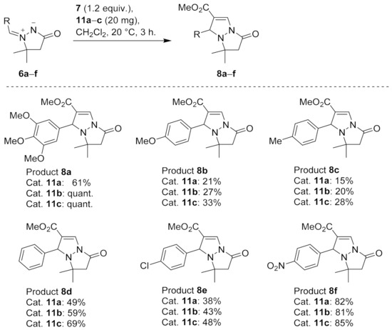 With the desired new catalysts 11a–c in our hands, we first examined their catalytic activity in model cycloaddition (6a + 7 → 8a, Table 3). After 3 h in the presence of 30 mg (~20 mol%) of the catalyst 11, 1,2-ethylenediamine-based catalyst 11a showed only moderate performance (61% conversion, Table 3, entry 1), while activities of 1,2-phenylenediamine-based catalyst 11b and pyridine-based catalyst 11c (Table 3, entries 2 and 3) were similar to that of catalyst 5f (cf. Table 2, entry 3). Further evaluation of catalysts 11b and 11c in terms of catalyst loading (Table 3, entries 4–7) and reaction time (Table 3, entries 8–11) confirmed the performance of 11b and 11c, which was similar to that of catalyst 5f (cf. Table 2, entries 1–7).