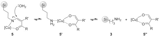 To our disappointment, reusability tests for catalysts 11a–c in the standard model reaction (6a + 7 → 8a, 3 h, 30 mg of 11) revealed only minor improvement of reusability of catalysts 11a–c in comparison to catalyst 5f. Initially highly active catalysts 11b and 11c became inactive upon the third run (see Figure 2 at the end of Section 2.1). On the basis of these data, it became clear that decoordination of Cu(II) from the ligand was not the main reason for low reusability of 5f and 11a–c. We then considered that loss of catalytic activity could also be explainable by detachment of Cu(II)-enaminone complex from 3-aminopropyl silica gel (3), for example, through hydrolytic cleavage of the enamine C-N bond, as proposed in Scheme 5. Hydrolysis of enaminone complex 5 gives the complex 5′, which can release Cu(II)-1,3-dicarbonyl complex 5″ in solution through decoordination from aminopropyl silica gel 3.