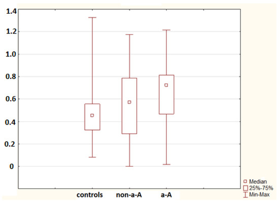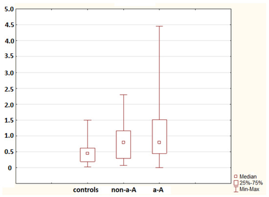 Data were treated statistically by means of descriptive statistics. Data with an abnormal distribution (majority) were analyzed by the non-parametric Mann–Whitney test, and data with a normal distribution were analyzed by a parametric unpaired t-test. Statistica software (version 13, 2013, Tulsa, OK, USA) was used. ANOVA was used as well (one-way and two-way ANOVA, Kruskal–Wallis one-way ANOVA on ranks, all pairwise multiple-comparison procedures with Dunn’s method and the Holm–Sidak method) using SigmaStat software (version 3.1, Jandel Corp, Erkrath, Germany).
