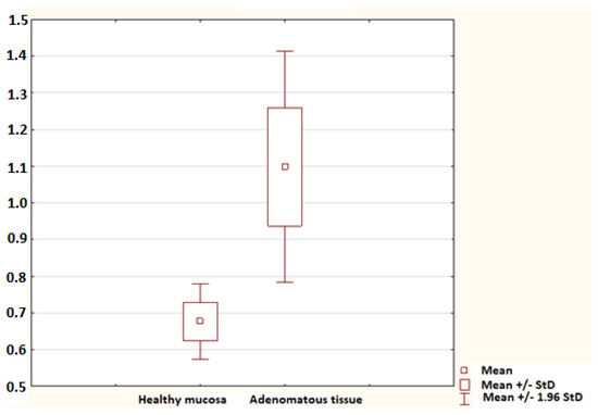 Figure 6. The mRNA for S100A11 in the healthy mucosa of the advanced adenoma group (healthy mucosa; 30 samples) and advanced adenomatous tissue (adenomatous tissue; 9 samples). A statistically significant difference was found (p = 0.029).