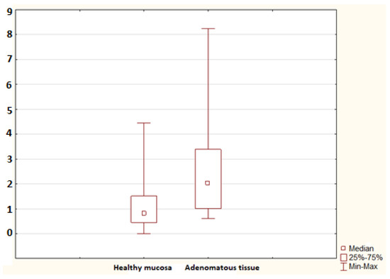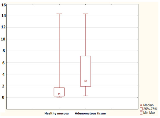 Figure 4. The mRNA for S100A8 in the healthy mucosa of the advanced adenoma group (healthy mucosa; 30 samples) and advanced adenomatous tissue (adenomatous tissue; 9 samples). A statistically significant difference was found (p = 0.002).