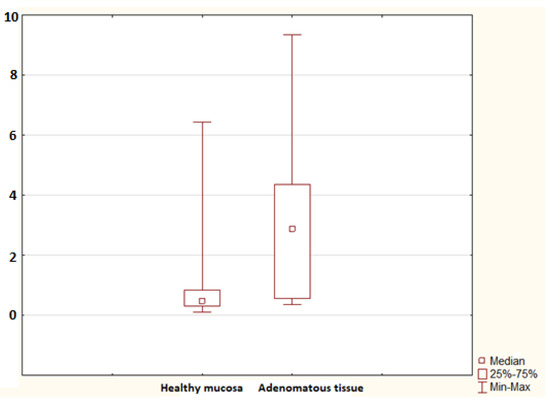 Figure 5. The mRNA for S100A9 in the healthy mucosa of the advanced adenoma group (healthy mucosa; 30 samples) and advanced adenomatous tissue (adenomatous tissue; 9 samples). A statistically significant difference was found (p = 0.021).