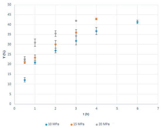 Impregnation yield as a function of the pressure and process time for supercritical solvent impregnation (SSI) of commercial cellulose acetate (CA) membranes at 40 °C.