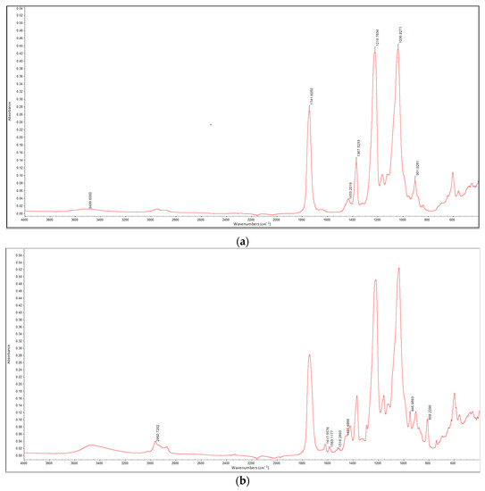 To confirm the presence of thymol on the surface of impregnated membranes, FTIR analysis was performed. Spectra of the neat CA membrane and CA membrane with 20% of thymol are presented in Figure 2a,b, respectively. Characteristic peaks for cellulose acetate are observed in the spectrum of the neat CA membrane (Figure 2a). The broad absorption band at 3500 cm−1 is assigned to O-H stretching of the hydroxyl group [11,24,25,26,27,28]. The peak at 1741 cm−1 is ascribed to the stretching mode of the C=O group [11,25,26,27,28,29]. The bands at 1433, 1367, and 1219 cm−1 are assigned to the C-H bending, rocking, and wagging vibrations, respectively [11,18,20]. The peak at 1036 cm−1 originates from C-O-C (ether linkage) from the glycosidic unit, while the peak at 901 cm−1 is a characteristic of saccharide [11,24,26,27].