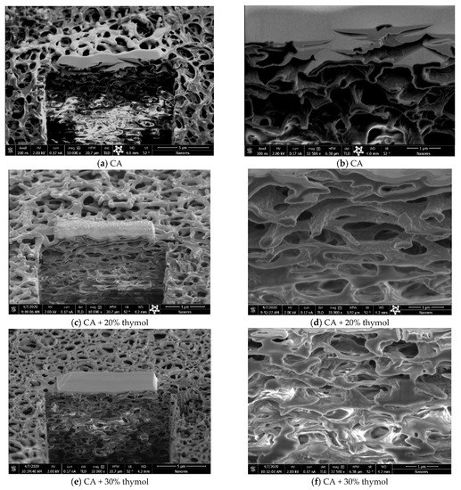 The possible effect of polymer swelling on the membrane microstructure was also studied by applying the energy-focused beam of gallium ions, which allowed for the sample cross-section during the SEM investigation. The cross-sections of the neat CA membrane and membranes with 20% and 30% of thymol are presented in Figure 4. Comparison of the micrographs 4a–4d showed that swelling occurred in the sample with 20% of thymol, but indicated that the membrane’s microstructure had been preserved. On the contrary, in the case of the sample with 30% of thymol, polymer swelling affected the membrane’s microstructure (micrographs 4e and 4f). This finding is in accordance with the observed slight wrinkling of membranes with more than 30% of thymol.