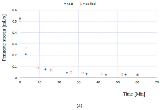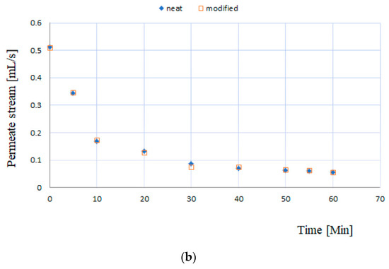 The change in permeate stream during E. coli culture broth filtration at 20 °C; mean values based on three measurements, maximal average relative deviation (RD) = 5.1%. (a) Initial cell concentration in feed 115.9 × 106 CFU/mL, feed volume 300 mL, and ΔP = 0.2 MPa; (b) initial cell concentration in feed 25.2 × 106 CFU/mL, feed volume 450 mL, and ΔP = 0.2 MPa.