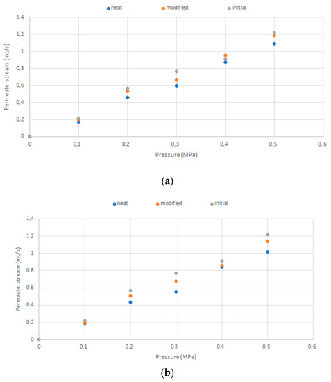 The water permeate stream flow rate as a function of pressure at 20 °C—mean value based on three measurements, maximal average RD = 7.5%. (a) Neat and modified membrane after incubation in S. aureus broth culture; (b) neat and modified membrane after incubation in E. coli broth culture.