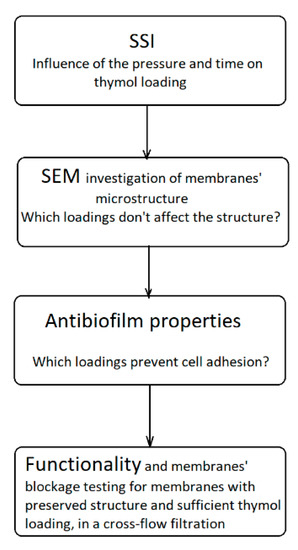 The research comprised four stages (Figure 9). In the first stage, the potential of the SSI to modify CA membranes was explored. Thymol loadings were determined as a function of pressure and time in a batch impregnation process. In the next step, scanning electron and ion microscopy was applied to investigate the SSI’s influence on membranes’ microstructure. The task was to identify high thymol loadings that do not affect the structure. The third stage aimed to investigate the antibiofilm properties of impregnated membranes against selected strains. Besides standardized microbiological procedures, scanning electron microscopy was employed to observe the biofilm presence at the membranes’ surface. The task was to identify thymol loadings that provide strong antibiofilm properties. Based on the second and third stage results, membranes with retained structures and sufficient thymol quantities to provide strong antibacterial properties were selected for the functionality testing in a cross-filtration system and comparison with the untreated CA membranes (stage four). The filtration process was modeled to quantify membranes’ performance. In this stage, the membranes’ blockage in static contact with selected strains was also investigated.