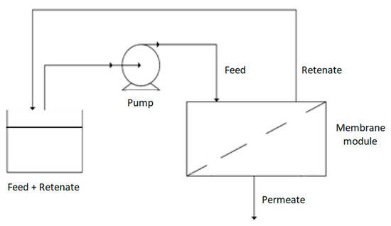 where J is the permeate flux (m3/(m2 s)), ΔP is the transmembrane pressure (Pa), µ is the dynamic viscosity (Pa s), Rtot is the total membrane resistance (with adhered contaminants) (m−1), Rm is the membrane resistance (m−1), and Rf is the cake (adhered material) resistance (m−1).