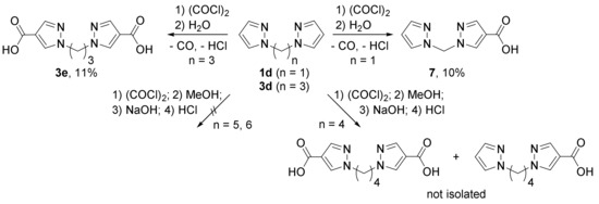 Carboxylation by oxalyl chloride proved to be poorly suitable for bis(pyrazol-1-yl)alkanes without electron-donating methyl groups. Thus, only in the case of 1,3-bis(pyrazol-1-yl)propane 3d a dicarboxylation product could be isolated, while bis(pyrazol-1-yl)methane 1d gave solely a monocarboxylated product 7 (Scheme 3). Even a large excess of oxalyl chloride and prolonged heating did not lead to the formation of the dicarboxylic acid. For derivatives with longer spacers (four to six methylene groups) only traces of carboxylation products (after conversion to methyl esters) were detected (for substrate 4c) but were not isolated (Scheme 3).