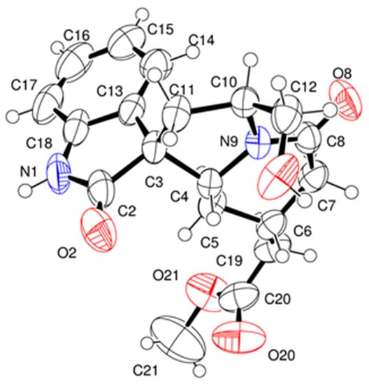 (1’R,7′S,8a’R)-7′-(2-Hydroxyethyl)-2,5′-dioxospiro[indoline-3,1′-indolizidine] (9): Lithium borohydride (LiBH4, 20 mg, 0.9 mmol) was added at 0 °C under an argon atmosphere to a solution of compound 8 (49 mg, 0.15 mmol) in anhydrous THF (5 mL). The resulting mixture was stirred at room temperature for 72 h. The reaction was quenched at 0 °C by distilled H2O (5 mL), and the mixture was concentrated under reduced pressure using a rotary evaporator with a dry ice condenser. Flash chromatography (95:5 EtOAc-MeOH) of the resulting residue gave oxindole 9 (34 mg, 76%) as a white foam and minor amounts of indoline 10 (3 mg, 5%). Oxindole 9: [α]22D = + 58,0 (c 1.12, MeOH); IR (film): 3100–3600 (NH, OH), 1731, 1714 (CO) cm−1; 1H-NMR (400 MHz, CDCl3, COSY, g-HSQC): δ = 0.64 (q, J = 12.0 Hz, 1H, H-14), 1.43 (m, 2H, CH2CH2O), 1.64 (dm, J = 12.0 Hz, 1H, H-14), 1.90 (dd, J = 17.6, 12.0 Hz, 1H, H-20), 2.05 (m, 2H, H-6, H-15), 2.49 (dt, J = 10.4 Hz, 1H, H-6), 2.58 (dd, J = 17.6, 5.2 Hz, 1H, H-20), 3.60 (t, J = 6.4 Hz, 2H, CH2O), 3.80 (dd, J = 11.6, 9.2 Hz, 1H, H-5), 3.98 (m, 2H, H-5, H-3), 6.91 (d, J = 7.6 Hz, 1H, HAR), 6.97 (d, J = 8.0 Hz, 1H, HAR), 7.04 (t, J = 7.6 Hz, 1H, HAR), 7.26 (td, J = 7.6, 1.2 Hz, 1H, HAR), 8.83 (br. s, 1H, NH); 13C-NMR (100.6 MHz, CDCl3): δ = 29.5 (C-15), 29.9 (C-14), 33.2 (C-6), 37.9 (C-20), 38.4 (CH2CH2O), 43.8 (C-5), 57.0 (C-7), 59.7 (CH2O), 64.6 (C-3), 110.3 (CHAR), 123.1 (CHAR), 123.8 (CHAR), 128.6 (CHAR), 129.9 (CAR), 140.1 (CAR), 169.2 (CO), 177.5 (CO); HRMS (ESI) calcd for [C17H20N2O3 + Na+]: 323.1366, found: 323.1371. (1′S,7′S,8a’R)-7′-(2-Hydroxyethyl)-5′-oxospiro[indoline-3,1′-indolizidine] (10): IR (film): 3346 (NH, OH), 1606 (CO) cm−1; 1H-NMR (400 MHz, CDCl3, COSY, g-HSQC): δ = 0.69 (q, J = 12.4 Hz, 1H, H-14), 1.48 (m, 2H, CH2CH2O), 1.83–1.92 (m, 2H, H-14, H-20), 1.97–2.08 (m, 2H, H-15, H-6), 2.25 (ddd, J = 12.8, 8.4, 2.0 Hz, 1H, H-6), 2.54 (ddd, J = 17.6, 5.2, 1.6 Hz, 1H, H-20), 3.50–3.66 (m, 2H, H-5, H-3), 3.51 (d, J = 9.2 Hz, 1H, H-2), 3.57 (d, J = 9.2 Hz, 1H, H-2), 3.65 (t, J = 6.4 Hz, 2H, CH2CH2O), 3.83–3.91 (m, 1H, H-5), 6.66 (d, J = 7.6 Hz, 1H, HAR), 6.71 (t, J = 7.6 Hz, 1H, HAR), 6.77 (dd, J = 7.6, 1.6 Hz, 1H, HAR), 7.08 (td, J = 7.6, 1.2 Hz, 1H, HAR); 13C-NMR (100.6 MHz, CDCl3): δ = 29.7 (C-15), 30.3 (C-14), 35.9 (C-6), 38.2 (C-20), 38.7 (CH2CH2O), 43.5 (C-5), 54.9 (C-2), 55.4 (C-7), 60.0 (CH2CH2O), 66.1 (C-3), 110.1 (CHAR), 119.5 (CHAR), 124.0 (CHAR), 128.5 (CHAR), 131.0 (CAR), 151.2 (CAR), 169.2 (CO); HRMS (ESI) calcd for [C17H22N2O2 + H+]: 287.1754, found: 287.1758.