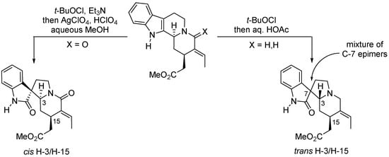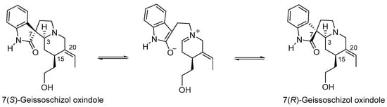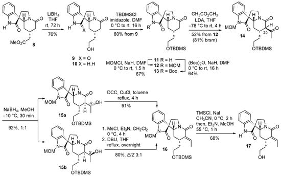 (1′R,6′E,7′S,8a’R)-7′-{2-[(tert-Butyldimethylsilyl)oxy]ethyl}-6′-ethylidene-1-(methoxymethyl)-2,5′-dioxospiro[indoline-3,1′-indolizidine] (16). From alcohol 15a: N,N′-Dicyclohexylcarbodiimide (DCC, 54 mg, 0.26 mmol) and copper(I) chloride (CuCl, 52 mg, 0.52 mmol) were added under an argon atmosphere to a solution of alcohol 15a (26 mg, 0.05 mmol) in anhydrous toluene (1.6 mL), and the resulting mixture was stirred at reflux for 5 h. The suspension was filtered through Celite®, and the residue was washed with CH3CN. The resulting filtrate was kept in the freezer overnight and filtered again through Celite®, washing with minimal amounts of cold CH3CN. The organic filtrate was concentrated under reduced pressure. Flash chromatography (1:9 hexane-EtOAc) of the resulting residue gave the E-ethylidene derivative 16 (22 mg, 91%). From alcohol 15b: First step: Et3N (18 μL, 0.13 mmol) and mesyl chloride (MsCl, 9 μL, 0.11 mmol) were added at 0 °C under an argon atmosphere to a solution of alcohol 15b (21 mg, 0.04 mmol) in anhydrous CH2Cl2 (0.6 mL). The resulting mixture was stirred at 0 °C for 4 h. Saturated aqueous NH4Cl (1.2 mL) was added, and the mixture was extracted with CH2Cl2. The combined organic extracts were dried over anhydrous MgSO4, filtered, and concentrated under reduced pressure to give the corresponding mesylate, which was used in the next step without further purification. Second step: Diazabicycloundecene (DBU, 27 μL, 0.18 mmol) was added under an argon atmosphere to a solution of the above mesylate in anhydrous THF (0.6 mL), and the resulting mixture was stirred at reflux overnight. Distilled H2O was added, and the mixture was extracted with EtOAc. The combined organic extracts were dried over anhydrous MgSO4, filtered, and concentrated under reduced pressure. Flash chromatography (hexane to 7:3 hexane-EtOAc) of the residue gave the Z isomer of compound 16 (4 mg, 20%) and the E-ethylidene derivative 16 (12 mg, 60%) as white foams. 16: [α]22D = −2.9 (c 0.76, CHCl3); IR (film): 1725, 1613 (CO) cm−1; 1H-NMR (400 MHz, CDCl3, COSY, g-HSQC): δ = −0.1 (s, 3H, CH3Si), −0.07 (s, 3H, CH3Si), 0.78 [s, 9H, C(CH3)3], 0.94–1.05 (q, J = 12.0 Hz, 1H, H-14), 1.29–1.36 (m, 1H, CH2CH2O), 1.65–1.70 (m, 1H, H-14), 1.77–1.85 (m, 4H, CH2CH2O, =CHCH3), 1.87–1.95 (dm, J = 12.4 Hz, 1H, H-6), 2.51 (m, 1H, H-6), 2.87–2.96 (m, 1H, H-15), 3.32 (s, 3H, CH3O), 3.36–3.52 (m, 2H, CH2CH2O), 3.88–4.30 (m, 3H, H-5, H-3), 5.14 (d, J = 10.8 Hz, 1H, NCH2O), 5.17 (d, J = 10.8 Hz, 1H, NCH2O), 6.67 (m, 1H, =CHCH3), 7.09–7.16 (m, 3H, HAR), 7.33 (td, J = 7.2, 1.6 Hz, HAR); 13C-NMR (100.6 MHz, CDCl3): δ = −5.5 (2CH3Si), 14.4 (=CHCH3), 18.1 [C(CH3)3], 25.8 [C(CH3)3], 30.8 (C-15), 31.1 (C-14), 34.8 (C-6), 39.4 (CH2CH2O), 44.6 (C-5), 56.3 (CH3O), 57.4 (C-7), 60.4 (CH2CH2O), 61.6 (C-3), 71.5 (NCH2O), 110.1 (CHAR), 123.5 (CHAR), 124.3 (CHAR), 128.7 (CHAR), 128.8 (CAR), 133.5 (=CHCH3), 135.7 (C-20), 141.2 (CAR), 167.6 (CO), 176.6 (CO); HRMS (ESI) calcd for [C27H40N2O4Si + H+]: 485.2830, found: 485.2825. Z-isomer of 16: IR (film): 1726, 1614 (CO) cm−1; 1H-NMR (400 MHz, CDCl3, COSY, g-HSQC, selected resonances): δ = −0.05 (s, 3H, CH3Si), −0.04 (s, 3H, CH3Si), 0.81 [s, 9H, C(CH3)3], 1.54–1.64 (m, 1H, H-14), 1.83 (m, 1H, CH2CH2O), 2.04 (ddd, J = 12.4, 7.6, 1.6 Hz, 1H, H-6), 2.20 (dd, J = 7.2, 2.0 Hz, 3H, =CHCH3), 2.54–2.60 (m, 1H, H-6), 3.32 (s, 3H, CH3O), 3.48–3.60 (m, 2H, CH2CH2O), 3.83–3.89 (m, 1H, H-5), 4.02–4.08 (m, 2H, H-3, H-5), 5.15 (s, 2H, NCH2O), 5.94 (qd, J = 7.2, 2.0 Hz, 1H, =CHCH3), 6.99 (dd, J = 8.0, 1.2 Hz, 1H, HAR), 7.07–7.11 (m, 2H, HAR), 7.31 (td, J = 7.6, 1.2 Hz, 1H, HAR); 13C-NMR (100.6 MHz, CDCl3, selected resonances): δ = −5.5 (CH3Si), −5.4 (CH3Si), 15.8 (=CHCH3), 18.1 [C(CH3)3], 25.8 [C(CH3)3], 29.8 (C-14), 34.1 (C-6), 36.2 (CH2CH2O), 44.0 (C-5), 56.3 (CH3O), 57.0 (C-7), 60.3 (CH2CH2O), 63.9 (C-3), 71.4 (NCH2O), 109.9 (CHAR), 123.6 (CHAR), 123.9 (CHAR), 128.6 (CHAR), 132.1 (CAR), 134.2 (=CHCH3), 141.2 (CAR), 165.5 (CO), 176.4 (CO); HRMS (ESI) calcd for [C27H40N2O4Si + H+]: 485.2830, found: 485.2825.