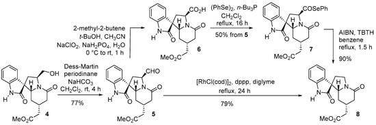 (1′R,7′R,8a’R)-7′-(Methoxycarbonylmethyl)-2,5′-dioxospiro[indoline-3,1′-indolizidine] (8). Method A: from seleno derivative 7: Azobisisobutyronitrile (AIBN, 9 mg, 0.05 mmol) was added under an argon atmosphere to a solution of seleno derivative 7 (216 mg, 0.43 mmol) in anhydrous benzene (20 mL). The mixture was heated to reflux, and a solution of tributyltin hydride (TBTH, 180 µL, 0.65 mmol) in anhydrous benzene (4 mL) was added very slowly (over 30 min). The resulting mixture was stirred at reflux for 1 h, and the solvent was evaporated. Flash chromatography (6:4 hexane-EtOAc to 100% EtOAc) of the resulting residue gave spirooxindole 8 (127 mg, 90%). Method B: from aldehyde 5: Argon was bubbled through anhydrous diglyme (3.2 mL) for 30 min. Chloro(1,5-cyclooctadiene)rhodium(I) dimer (3 mg, 0.006 mmol) and 1,3-bis(diphenylphosphino) propane (dppp, 10 mg, 0.023 mmol) were weighed in corning tubes and introduced into the reaction flask under an argon flow using inert glovebox equipment. Anhydrous diglyme (2.2 mL) was transferred into the reaction flask and the bubbling of argon was continued for 15 min. Aldehyde 5 (80 mg, 0.23 mmol) was dissolved in anhydrous diglyme and transferred into the flask. The mixture was stirred at reflux for 24 h. Distilled H2O (2.2 mL) and CH2Cl2 (2.2 mL) were added, the layers were separated, and the aqueous phase was extracted with CH2Cl2. The combined organic extracts were washed with brine, dried over anhydrous MgSO4, filtered, and concentrated under reduced pressure. Flash chromatography (1:1 to 1:9 hexane-EtOAc) of the resulting residue gave compound 8 (57 mg, 75%) as a white foam and minor amounts of its 5,6-dehydro derivative, which was hydrogenated (10% Pd/C, absolute EtOH) to give additional compound 8 (3 mg, 4%) after flash chromatography: [α]22D = + 63.0 (c 0.55, CHCl3); IR (film): 3194 (NH), 1727, 1619 (CO) cm−1; 1H-NMR (400 MHz, CDCl3, COSY, g-HSQC): δ = 0.72 (q, J = 12.4 Hz, 1H, H-14), 1.67 (dm, J = 12.4 Hz, 1H, H-14), 1.95 (dd, J = 17.6, 12.0 Hz, 1H, H-20), 2.09 (dd, J = 12.4, 8.4 Hz, 1H, H-6), 2.14 (dd, J = 15.6, 7.6 Hz, 1H, CH2CO), 2.23 (dd, J = 15.6, 6.4 Hz, 1H, CH2CO), 2.35 (m, 1H, H-15), 2.52 (q, J = 12.4 Hz, 1H, H-6), 2.61 (dd, J = 17.6, 4.8 Hz, 1H, H-20), 3.61 (s, 3H, CH3O), 3.83 (t, J = 11.2 Hz, 1H, H-5), 3.99 (tm, J = 11.2 Hz, 1H, H-5), 4.04 (dd, J = 11.2, 4.4 Hz, 1H, H-3), 6.91 (d, J = 7.2 Hz, 1H, HAR), 6.99 (d, J = 7.6 Hz, 1H, HAR), 7.05 (t, J = 7.6 Hz, 1H, HAR), 7.28 (t, J = 7.6 Hz, 1H, HAR), 8.92 (br. s, 1H, NH); 13C-NMR (100.6 MHz, CDCl3): δ = 29.6 (C-15), 29.7 (C-14), 33.3 (C-6), 37.3 (C-20), 39.9 (CH2CO), 43.9 (C-5), 51.7 (CH3O), 56.9 (C-7), 64.3 (C-3), 110.5 (CHAR), 123.1 (CHAR), 123.7 (CHAR), 128.6 (CHAR), 129.7 (CAR), 140.2 (CAR), 168.4 (CO), 171.7 (CO), 177.5 (CO); HRMS (ESI) calcd for [C18H20N2O4 + H+]: 329.1496, found: 329.1497.